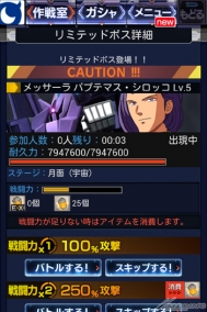 活動中出現的這個「限定頭目」,有著會出現與舉辦中的活動形象相符的敵人特徵。也就是說,先前結束的「從月球脫出」是以『Ζ高達』為基礎的活動,因此「限定頭目」為「傑利特+姆歷沙」與「萊拉+加爾巴迪β」、還有「西羅克+密沙羅」等等『Ζ高達』中的敵人角色與他們的座機。
