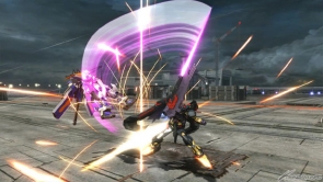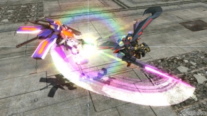 ▲EXBURST「舞蹈就到此結束了!」(BURST攻擊),發射槍鏢、使用幻象粒子隱形接近再以三犄改進行格鬥後以災禍生太刀箝制敵方、然後以螺旋状態將敵方砸向地面。