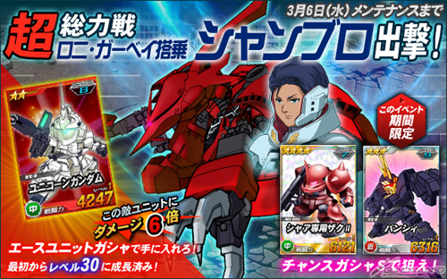 打倒珊布洛後可以抽獎的「機會轉蛋S」中,除了有機會獲得新稀有度的「★4」「馬沙專用渣古II」之外,在王牌轉蛋機中追加能對「羅妮‧加維搭乘的珊布洛」發揮6倍攻擊力的「獨角獸高達」。