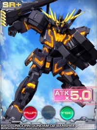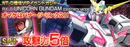 「NT-D機體VIP活動轉蛋」,就如同它的名稱一樣是特別的轉蛋,裡面有高攻撃力倍增獎勵的強力「特效卡片」。攻撃力2倍的「里澤爾隊長機」與攻撃力2.5倍的「安克夏」等等。尤其是能讓攻撃力變5倍的「獨角獸高達(毀滅模式)」,還附贈組合搭配能使攻撃力變3倍的「巴納吉・林克斯」超值卡片。