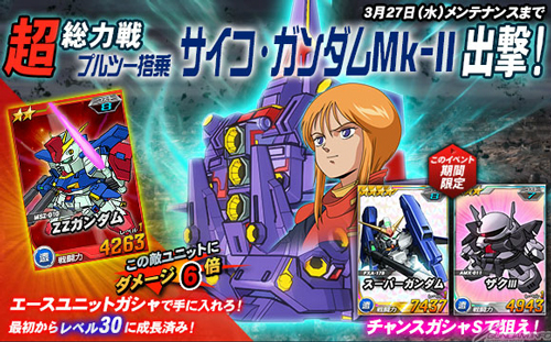 3月21日(四)12:00起到3月27日(三)為止的期間限定內,總力戰中「精神感應高達Mk-II(MA)」、超總力戰中「普魯二號搭乘的精神感應高達Mk-II(MA)」登場。期間中執行任務,有機會遭遇到這些強敵。