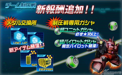「壓制戰轉蛋」中有只在這邊才能獲得的稀有機體與駕駛員,另外,「代幣交換所」可以藉由「代幣」來交換各種特殊道具等等。挑戰小隊壓制戰中的高名次為目標來獲得豪華報酬吧。