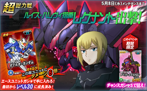 而打倒「露意絲.哈利維搭乘的尼古蘭度」時可以抽的機會轉蛋S中,除了有機會可以獲得「Ahead腦量子波對應型野莓」以外,在王牌機體轉蛋中追加可以對「露意絲.哈利維搭乘的尼古蘭度」發揮6倍攻擊力的「00高達」。