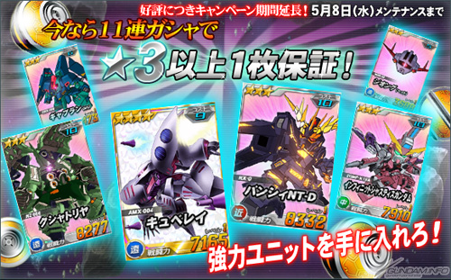 現在實施中的「連續11次轉蛋保證獲得★3以上機體1台活動」因廣受好評,決定將舉辦期間延長到5月8日(三)為止。