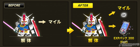 現行版本的「SDGO」在解體機體時只會獲得里程,但在大型更新「改變的世界」實施後,可以選擇「里程」或是「EXP PACK_200(Full)」其中之一。