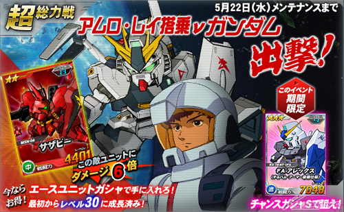 今天5月15日(三)12:00開始到5月22日(三)為止的限定期間內,超總力戰中「阿姆羅搭乘的ν高達」將會登場。期間中執行任務就有機會遇到「阿姆羅搭乘的ν高達」。