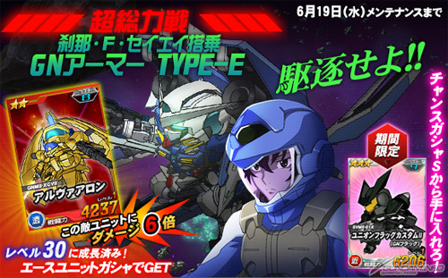 今天6月12日(三)12:00開始到6月19日(三)為止的限定期間內,在超總力戰中「刹那搭乘的GN裝甲模組TYPE-E」將登場。期間中進行任務時,有機會遇上「刹那搭乘的GN裝甲模組TYPE-E」。