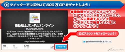 キャンペーン期間中に、「機動戦士ガンダムオンライン」公式アカウントをフォローしてツイートしたユーザーの中から、抽選で10名に500万GPをプレゼント!
