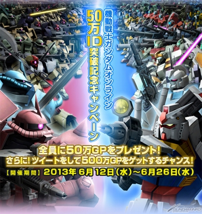 詳しくは「機動戦士ガンダムオンライン」公式サイトの 「50万ID突破記念キャンペーン」特設ページをご覧ください。