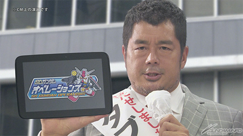 CM影片將由髙田延彦和大川藍參與演出。前些時後公開的Windows專用網路遊戲「機動戰士高達ONLINE」的TVCM是「更新黨」,這次則是以「平板黨」的演說來介紹「SD GUNDAM OPERATIONS」的魅力。