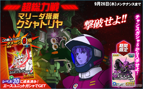 打倒「瑪莉妲搭乘的剎帝利」的時候可以抽機會轉蛋S,除了有機會獲得「茲拿.祖魯(安傑洛.梭裴專用機)」外,在王牌機體轉蛋中追加了能對「瑪莉妲搭乘的剎帝利」發揮6倍攻擊力的「獨角獸高達(NT-D)」。