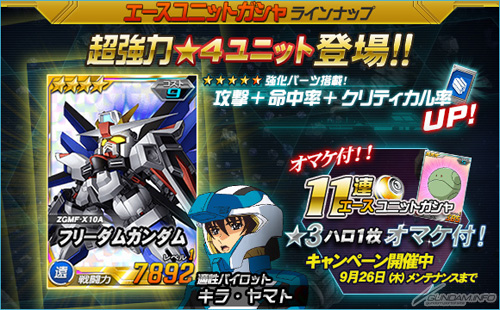 王牌機體轉蛋同樣從今天起追加「★4 自由高達」以及「★3達基‧伊斯(白)」等強力機體。