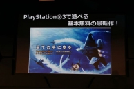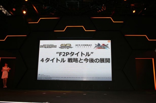 這一天攤位内的舞台活動,是由好評提供中的PS3專用網路戰鬥動作遊戲「機動戰士高達 激戰任務」和「鐵拳 Revolution」、「ACE COMBAT INFINITY」、「SOULCALIBUR Lost Swords」等作品的製作人,針對上述4款免基本費的F2P(=Free to Play)類型遊戲來做介紹並進行座談。