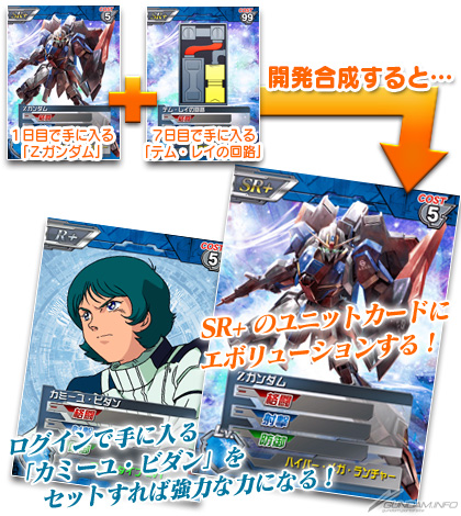 獎勵方面則有「R+ Ζ高達」、以及跟「R+ Ζ高達」進行開發合成就能獲得「SR+ Ζ高達」的「SR+ 提姆・雷的回路」等豪華禮品。