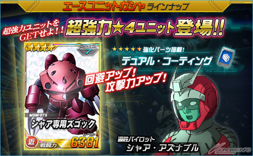 而除了「毀滅哥達魯(MS)」在總力戰中登場以外,王牌機體轉蛋中還新追加了超強力機體「★4 馬沙專用茲卡克」。