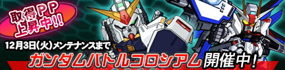 從今天起到12月3日(二)止的限定期間內,開始舉辦「高達鬥技場」、及「獲得PP增量活動」。「高達鬥技場」是透過「高達對戰」等方式,來獲得只有在活動期間中出現的「VP(勝利點數)」,並已獲得總量來一決勝負的活動。