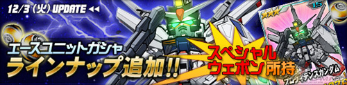 同樣從今天起,王牌機體轉蛋中追加了「★3 天意哥達魯」、「★3 高戰蟹」、「★2 哥達魯斯洛尼一型」、「★2 汗瑪‧汗瑪」。