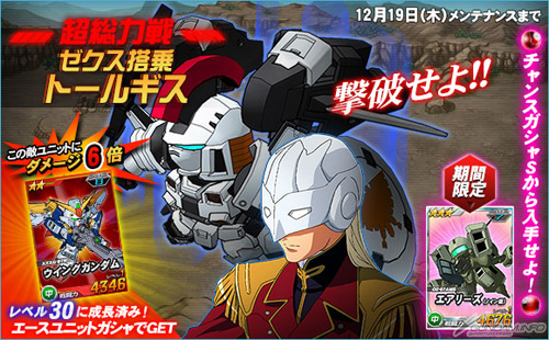NAMCO BANDAI ONLINE在「Yahoo!遊戲」上提供中的免基本費網頁遊戲「SD GUNDAM OPERATIONS」,從今天12月12日(四)起「傑克斯駕駛的多魯基斯」在超總力戰中登場。此外,王牌機體轉彈中追加了「★3 飛翼高達」等3台機體,白金駕駛員轉蛋中新追加了「★3 傑克斯・馬吉斯」、「★3 張五飛」,並開始「機體強化費用減少活動」。