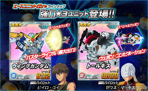 王牌機體轉蛋同樣從今天起追加了「★3 飛翼高達」、「★3 多魯基斯」、「★3 神龍高達」。「★3飛翼高達」以及「★3 多魯基斯」是搭載了特殊武裝的超強力機體,請一定要想辦法拿到手。