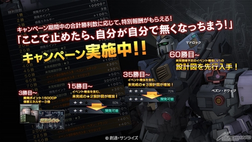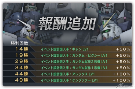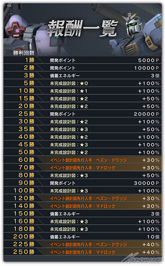 在報酬中有機會搶先獲得「泥岩(高達6號機)」和「培森・德瓦金」等等活動機體的設計圖,快累積勝利來獲得這些豐富的報酬吧。