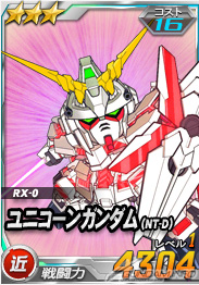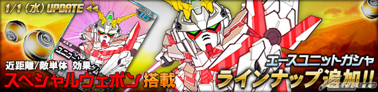 本日起在王牌機體轉蛋追加了持有強力特殊武器的「獨角獸高達(NT-D)」。請務必活用正在好評舉辦中的「連續11次轉蛋保證1枚★3機體活動」,務必來拿這台強力的機體。