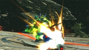 ▲高機動形態的副射撃,除了將隕石踢飛的射撃攻撃外,也可隨著搖桿輸入指令的變化,將隕石當作踏台作為急速接近的移動技。