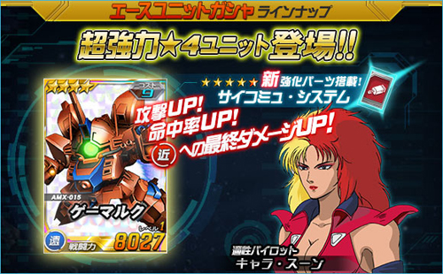 今天起在王牌機體轉蛋內追加的「★4 京麥古」是搭載強化零件「精神感應系統」的強力機體。務必要拿到手。