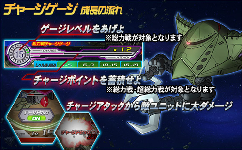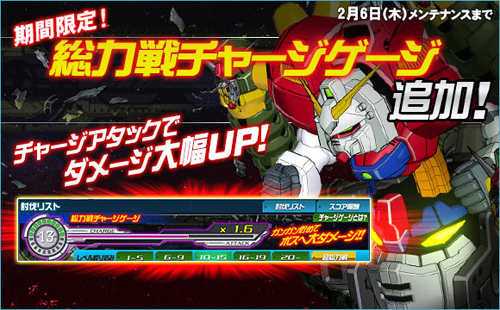 今天起在限定期間內追加「總力戰集氣攻擊機能」,在總力戰時攻擊敵方機體,增加「集氣量表」,就能夠在任意時候發動可以給予敵方機體大量傷害的「集氣攻擊」。集氣量表增加的越多,集氣攻擊能給對手的傷害就越高;盡量集氣,給予敵人大量傷害吧。