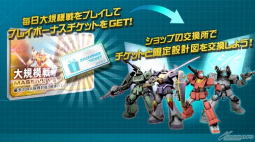 每進行大規模戰1次,就能獲得「遊戲獎勵券」,收集一定張數就可以到商店內新設置的「交換所」去兌換限定機體的設計圖和道具。