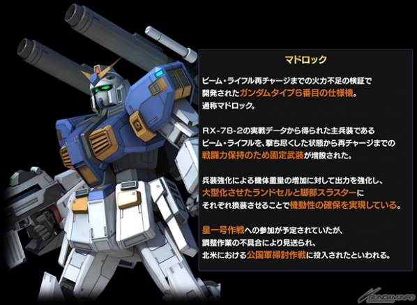 作為高達型6號機開發的「泥岩」,透過光束步槍及增設的固定武裝確保了高火力的同時,也靠著大型化的噴射背包和腳部噴射器來確保高機動性,請務必要獲得這台兼具火力以及機動力的特殊機體。