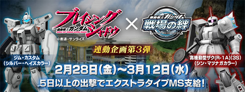 這次的活動是在活動期間中,在「全國對戰」或是「活動戰」出擊5天以上,病有獲得「吉姆・特裝型」或是「高機動型渣古(R-1A)(3S)」配給,就能得到EXTRA型MS的配給的活動。