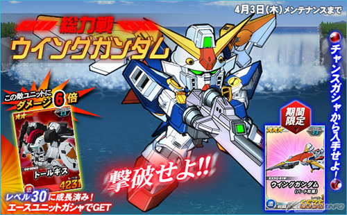 「飛翼高達」從本日起到4月3日(四)止的限定期間內,會在總力戰中登場。活動期間內進行任務的時候,有機會遭遇「飛翼高達」。