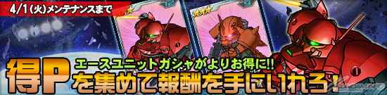 同樣於今天開始到4月1日(二)為止的「超值點數優惠活動」也開始了。本活動中,可以在抽「王牌機體轉蛋」或「11連王牌機體轉蛋」的時候,獲得點數(超值點數),而根據這些點數的合計值可以獲得各種報酬。累積超值點數來獲得「卡貝拉・迪特拉」和「渣古II(卡爾馬・薩比専用機)」吧。