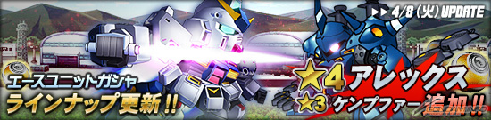 今天的更新中,王牌機體轉蛋中追加「★4 亞歷克斯」和「★3 京寶梵」。「★4亞歷克斯」是搭載強化零件「韋伯系統」的強力機體。而白金駕駛員轉蛋中也有「★3 米海爾.卡明斯基」登場,別忘了一併確認喔。