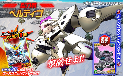 打倒「貝爾堤哥」時可以抽機會轉蛋,除了有機會獲得「★3 修拉葛(波拉貝爾)」以外,在王牌機體轉蛋中,還追加可以對「貝爾堤哥」發揮6倍攻擊力的「★2 高達X」。