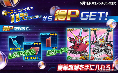 到5 月1日(四)止限期舉辦的「得P活動」,是根據抽「王牌機體轉蛋」和「11連王牌機體轉蛋」時所獲得的點數(得P)合計值,可以獲得各種報酬的活動。累積「得P」來換取「★3 神盾高達(MS)」、「★3 突擊高達I.W.S.P」等豪華報酬吧。