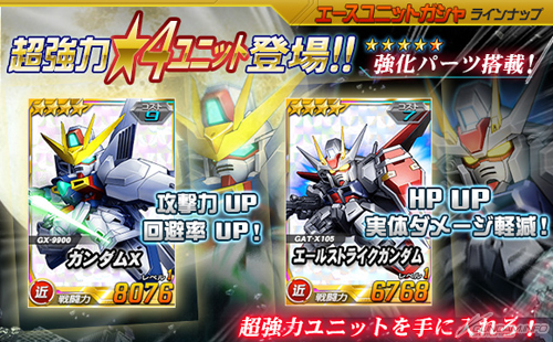 王牌機體轉蛋中,「★4 高達X」、「★4 機動型突擊高達」、「★3 比基納‧基娜」全新登場。「★4 高達X」、「★4 機動型突擊高達」等2台機體是搭載強化零件的強力機體。