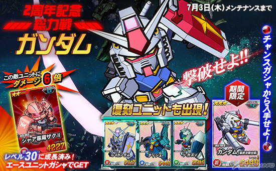 「高達」從本日起到7月3日(四)止的限定期間內,會在總力戰中登場。活動期間內進行任務的時候,有機會遭遇「高達」。