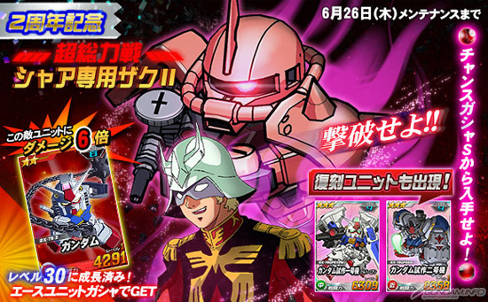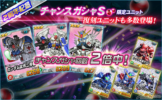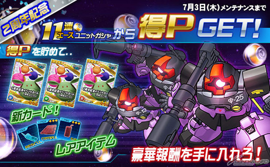 除了在王牌機體轉蛋中追加了「★3 哥達魯艾比安(MS)」、白金駕駛員轉蛋追加了「★3 諾里斯‧帕卡德」等卡片外,還開始舉辦紀念2周年的「2週連續 得P活動」。