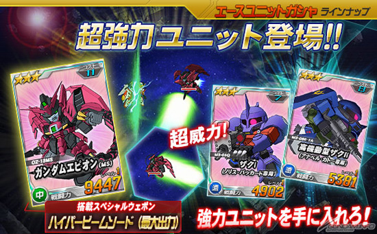 從今天起在王牌機體轉蛋中,除了有「★3 哥達魯艾比安(MS)」、「★3 高機動型渣古II(阿納貝爾‧賈圖專用)」、「★3 渣古I(諾里斯‧帕卡德專用)」等機體登場外,在白金駕駛員轉蛋中還有「★3 諾里斯‧帕卡德」、「★3 阿納貝爾‧賈圖」、「★3 米利亞爾特‧匹斯克拉福特」等駕駛員登場。這部分也請一併確認。