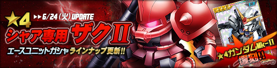 除此之外,王牌機體轉蛋也追加了「★4 馬沙専用渣古II」、「★3 自護號」,而「超值點數活動」和「六月新娘活動」也同時舉辦中。