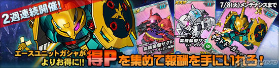 從今天起到7月8日(二)止的限定期間內,同時舉辦的「超值點數優惠活動」是在抽「王牌機體轉蛋」或「11連王牌機體轉蛋」時,可以獲得點數(超值點數)。而依照點數的合計值可以獲得各種報酬。快累積超值點數來拿「★3亞克托‧德卡(裘尼専用機)」和「★3 高機動型渣古II(松永真専用)」!。