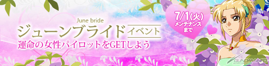 即日起到7 月1日(二)這段期間內限期舉辦的「六月新娘活動」,是追了了限期的特別指令,只要完成特別指令就能獲得PP(駕駛員點數)和白金轉蛋券。活動期間內將會在白金駕駛員轉蛋和駕駛員轉蛋中,追加平時無法獲得的女性駕駛員,請務必利用這個機會來拿吧。