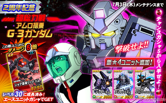 即日起到7月3日(四)止的限定期間內,「阿姆羅駕駛的G-3高達」將會在抄總力戰中登場,活動期間中進行任務時,有機會跟「阿姆羅駕駛的G-3高達」交戰。