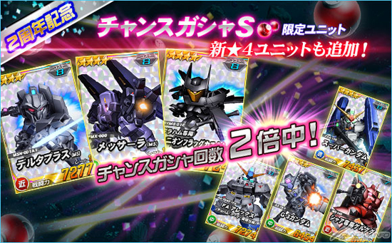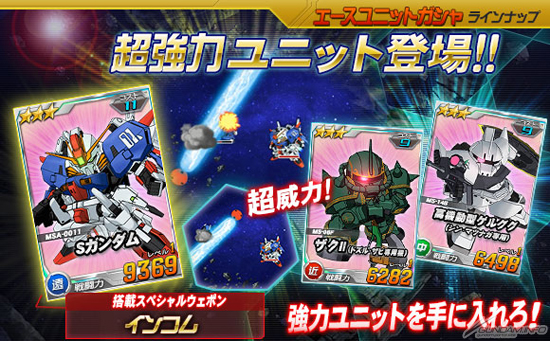 今天起在王牌機體轉蛋中除了有「★3 S高達」、「★3 渣古II(德茲爾・薩比專用機)」、「★3 高機動型格魯古古(松永・真專用)」登場外,白金駕駛員轉蛋中還有「★3 遼・魯茲」、「★3 德茲爾・薩比」、「★3 松永・真」等人登場。「★3 S高達」是搭載特殊武裝「導引砲」的強力機體,別忘了來確認一下這台機體喔。