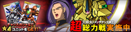 打倒「希羅克搭乘的THE・O」就可以抽機會轉蛋S,除了有機會獲得「★4 自由高達」、「★4 高達試作一號機 全方位推進型」、「★4 百式」、「★4 馬沙專用格魯古古」、「★4 京麥古」等機體外,王牌機體轉蛋中還追加了「★2 Z高達」」,這台機體對上「希羅克搭乘的THE・O」可以發揮3倍的攻擊力。