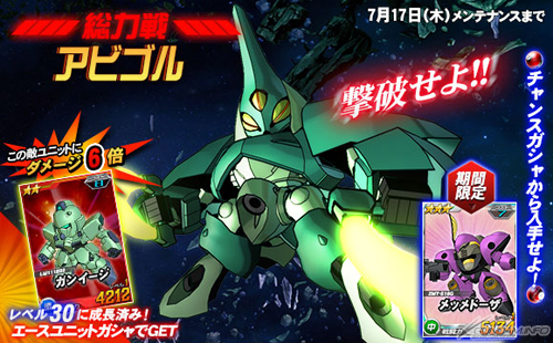打倒「亞別哥」就可以抽機會轉蛋,除了有機會獲得「★3 美杜莎」、「★3 暴風高達」、「★3 哥達魯艾斯亞 修補版」等機體外,王牌機體轉蛋中還追加了「★2 ★2 鋼意吉」,這台機體對上「亞別哥」可以發揮6倍的攻擊力。