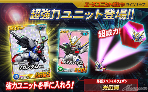 而今天起在王牌機體轉蛋中,新增了「「★4 V高達(MS)」、「★3 V2高達」、「★3 康提奧」等機體;「V2高達」是裝備了特別武裝「光之翼」的強力機體。白金駕駛員轉蛋也追加了「★3 胡索.艾溫」、「★3 庫羅諾克.阿瑟」等角色。別忘記要一併作個確認喔!