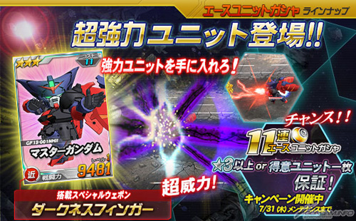 今天起王牌機體轉蛋中,追加了搭載特別武器「暗黑掌」的強力機體「★3 天王高達」,而白金駕駛員轉蛋中也追加了「★3 東方不敗亞洲天王」。