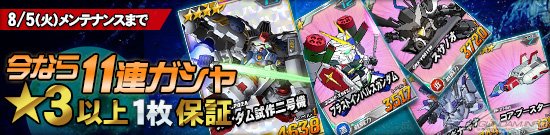 今天開始的「11連轉蛋保證獲得1張★3機體活動」是在活動期間中,只要來抽11連王牌機體轉蛋,就一定會獲得1張已成長到「Lv.20」的★3以上的機體,請一定要來挑戰看看,將強力的機體拿到手吧。